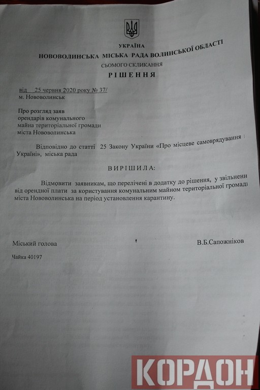 “Згідно постанови КМУ №211 від 11.03.2020, з 12 березня до 24 квітня на всій території України встановлено карантин. У зв’язку з карантином, орендарі комунального майна з незалежних від них причин (перебування в групі ризику за віком або станом здоров’я, заборон провадження певних видів діяльності, неможливість забезпечення 15 квадратних метрів площ приміщення на одного відвідувача), виконуючи постанову КМУ і рішення виконкому Нововолинської міськради були позбавлені можливості використовувати орендні приміщення”