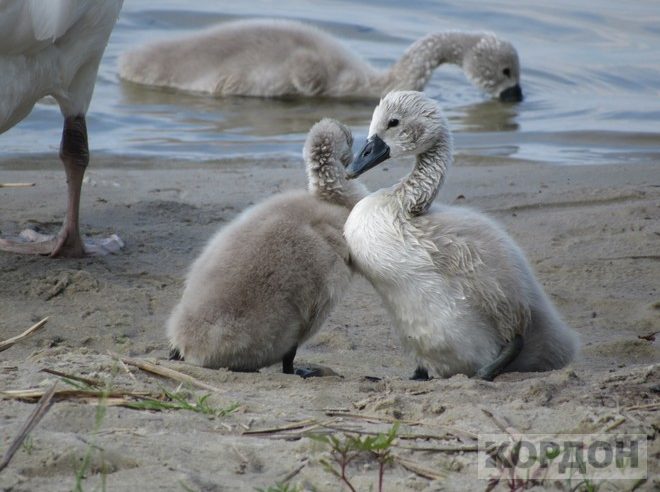 Відпочиваючі намагаються якомога ближче підійти до птахів, аби пильно поспостерігати за ними. Малеча синхронно повторює рухи мами, яка підпускає людей до дитинчат на відстань не ближчу 5-ти метрів. Дратуючись, лебідка видає гучний шипучий звук.