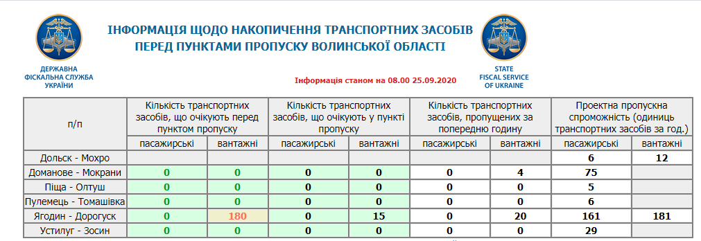 Так, перед пунктом пропуску «Ягодин» станом на ранок перебуває 180 вантажних транспортних засобів, які очікують в’їзду на територію Польщі, 20 вантажівок очікують у пункті пропуску.