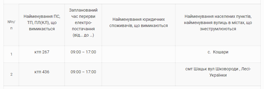 Так, зокрема, завтра не буде світла з 9 до 17 години у Шацькому районі. а саме: у селі Кошари та в райцентрі по вулицях Шковороди та Лесі Українки.