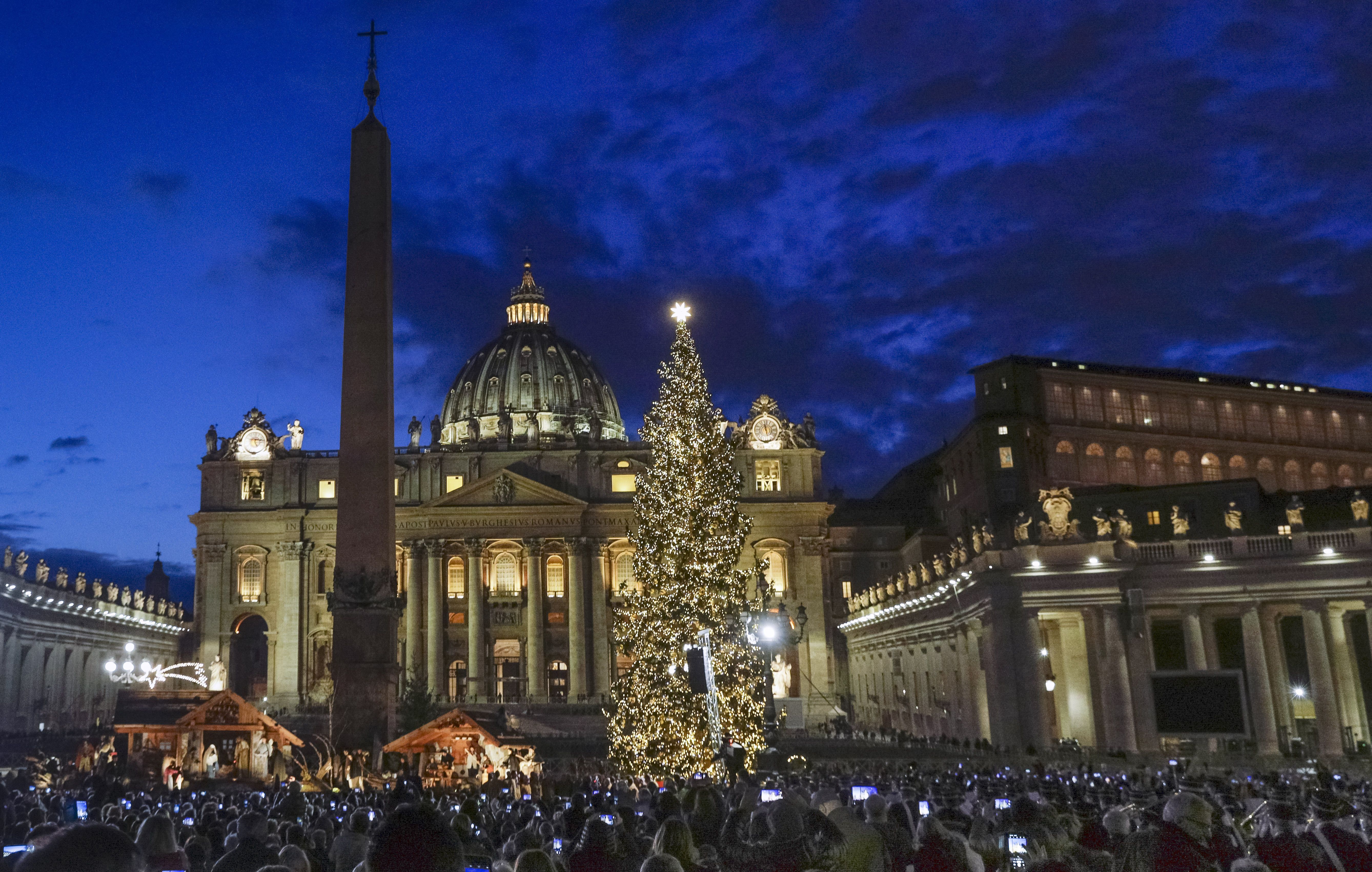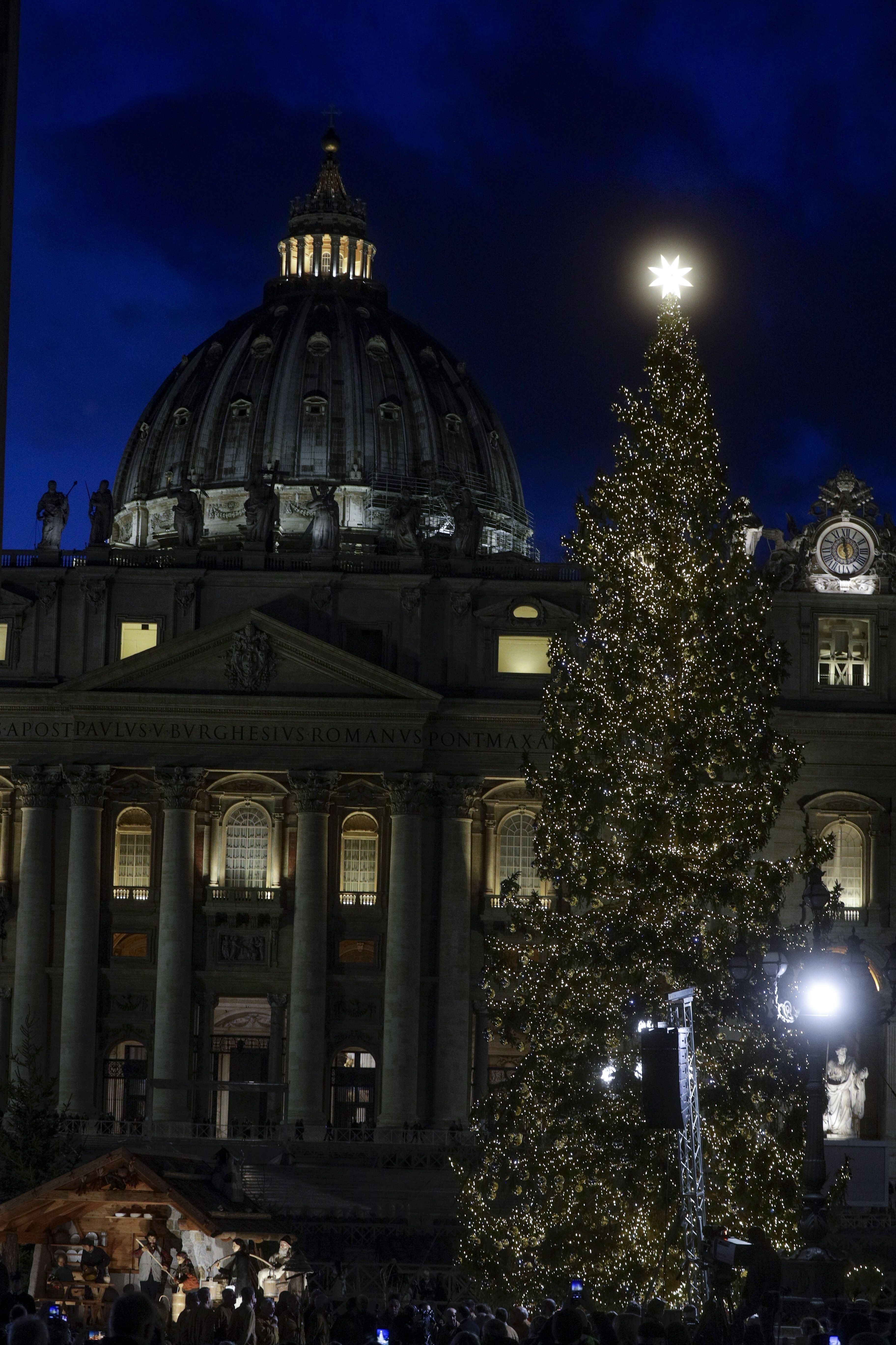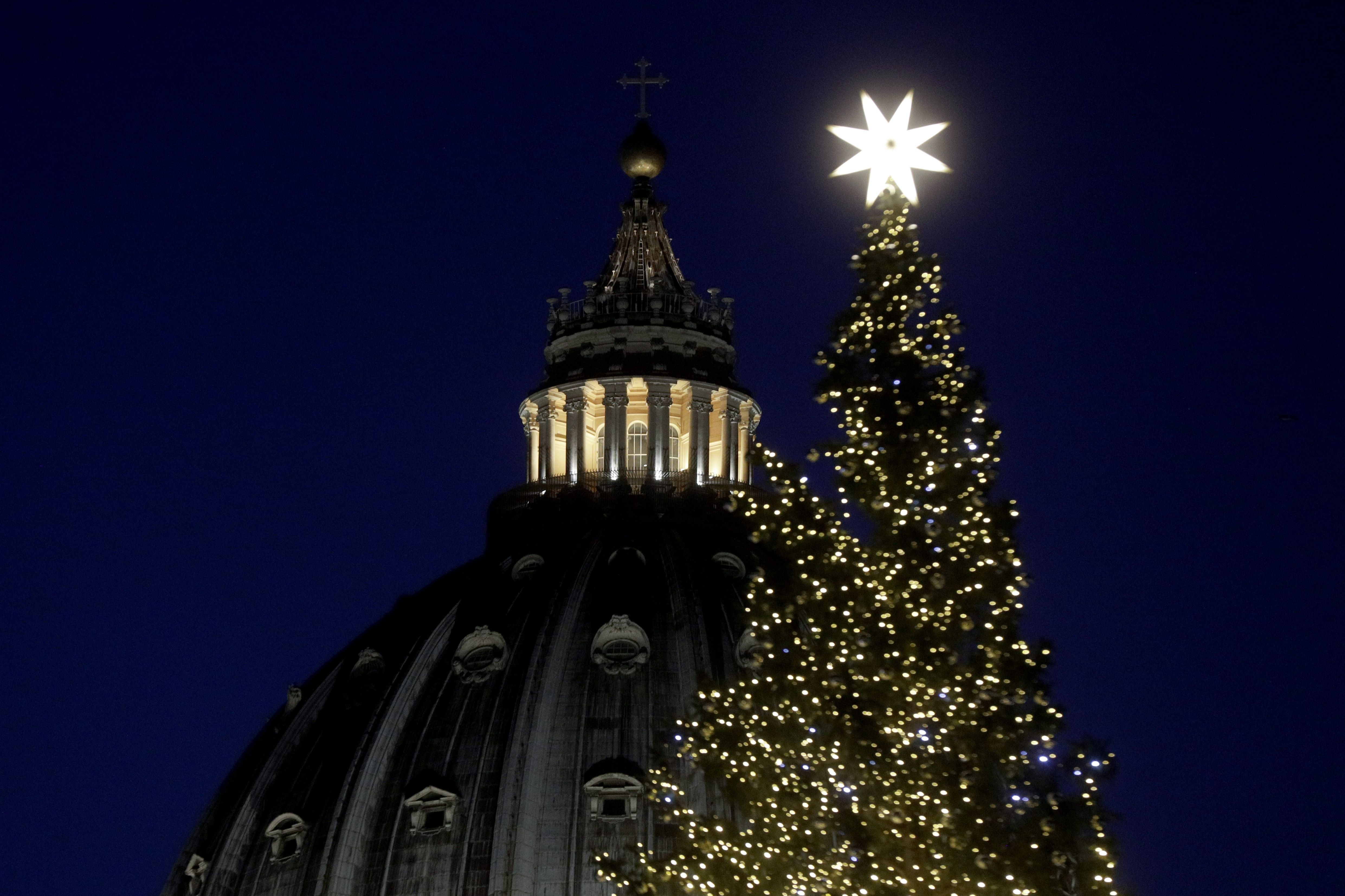 Скромну ялинку відкрили і у Ватикані. Вона вкрита жовтими гірляндами, а на верхівці сяє зірка.