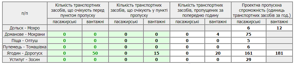 Так, перед пунктом пропуску “Ягодин” станом на ранок перебуває 50 вантажних транспортних засобів, які очікують в’їзду на територію Польщі, 15 вантажівок очікують у пункті пропуску.